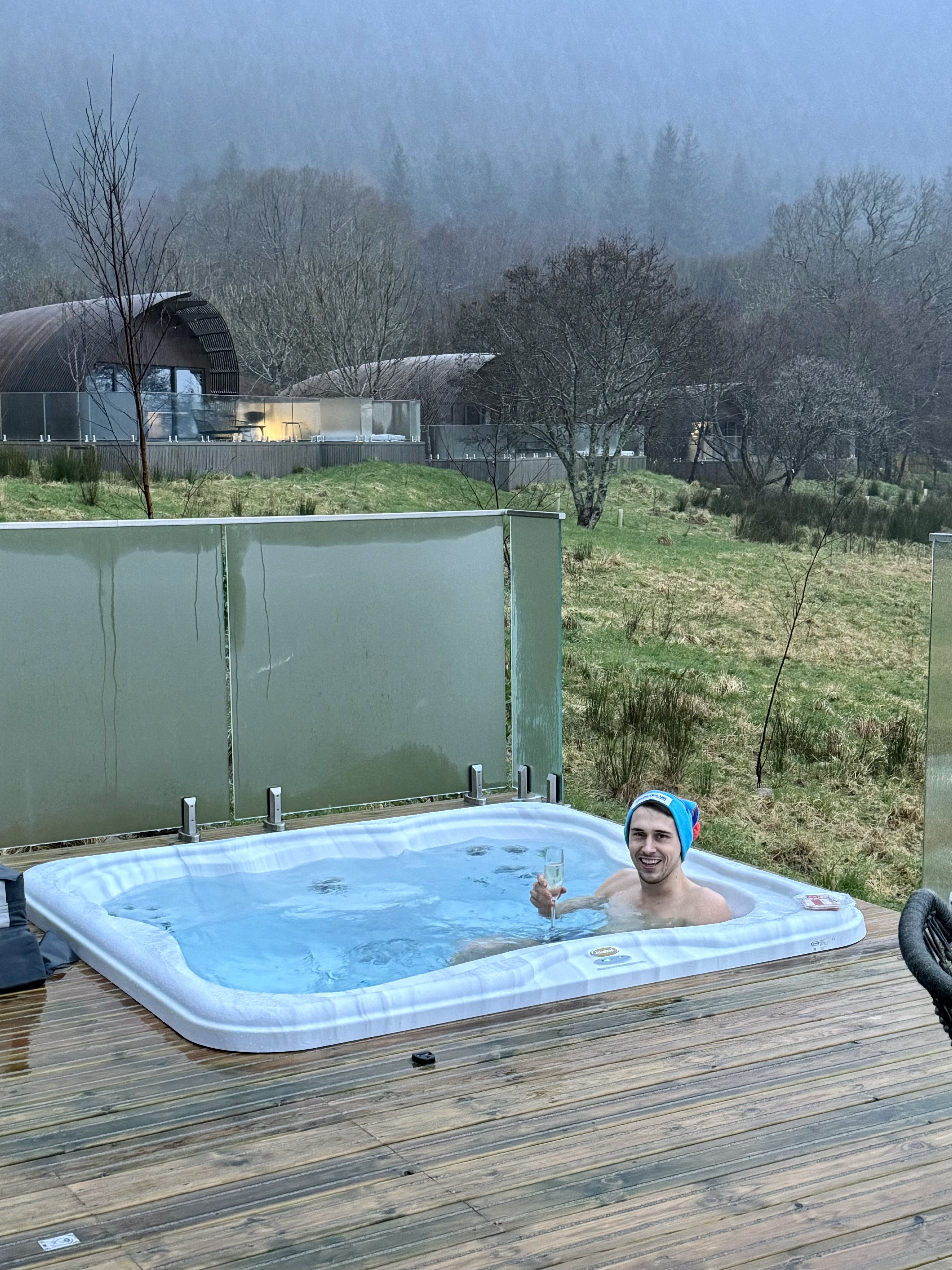Each lodge has its own jacuzzi hot tub, and we spent most evenings in ours (come rain or shine). The lodges themselves are nothing short of luxury with huge comfy beds and luxurious sheets, a cinema style drop down screen, and a daily complimentary breakfast which is delivered in a basket right outside your lodge.